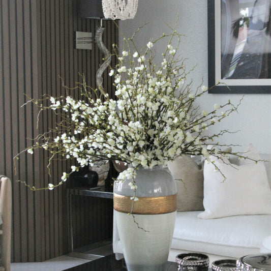 30" Glossy White Globe Vase with White Cherry Blossom Branches